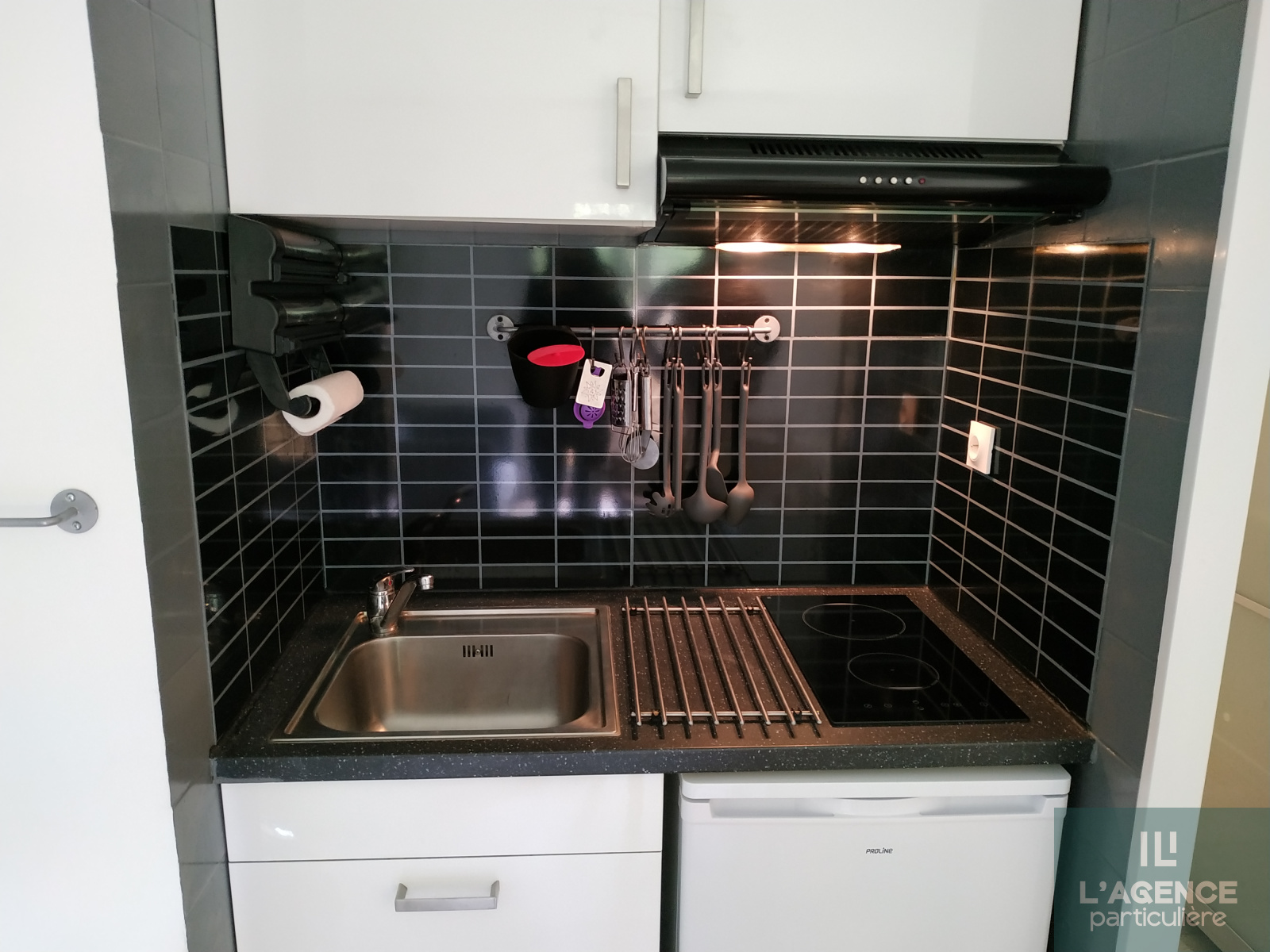 - Un coin cuisine (Plaques de cuisson, la hotte aspirante, le réfrigérateur...)