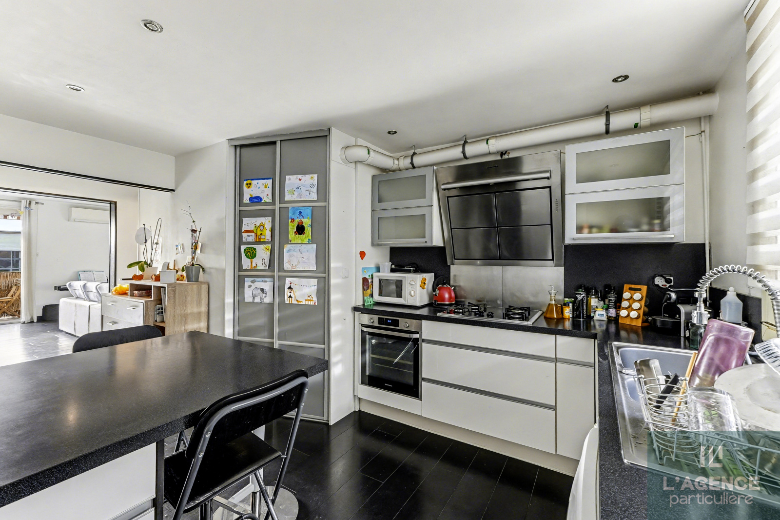 - Une cuisine meublée et équipée (plaque au gaz, hotte, four, lave-vaisselle)